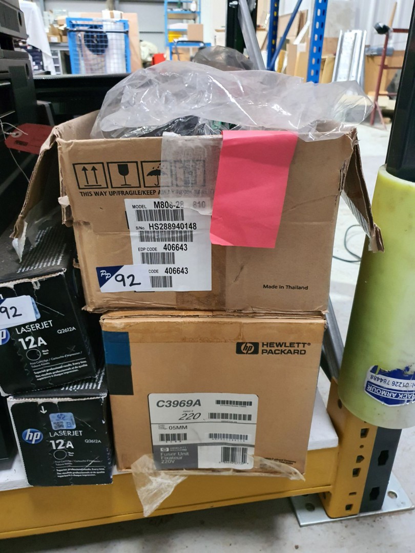 Qty various HP Q2612A black print cartridges (boxed) , maintenance kit SP4100-220 (boxed) , HP 3969A fusser unit fixture (boxed)