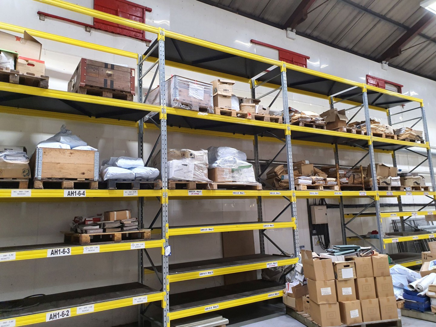 8 bays heavy duty boltless galvanised racking, multishelf, 2750x1100mm bay size, 6m high approx with boards & guarding (2018 & 2019)