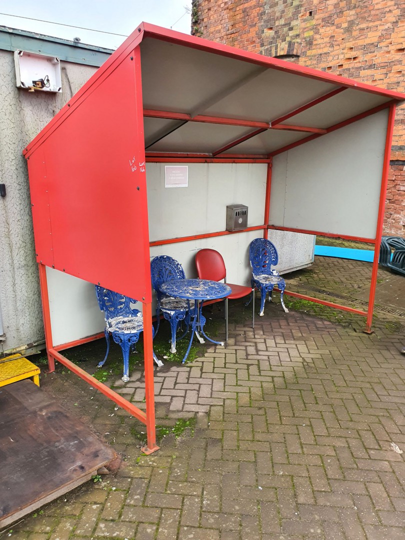 Metal frame cladded smoking shelter, 3000x1500x2000mm approx