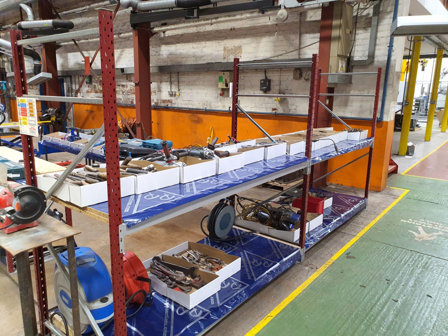 Qty various mobile platform trolleys, double sided mobile plastic bin storage racks, power tools, hand tools, air lines, tool chests, lights, transformers, small tooling, clamps etc