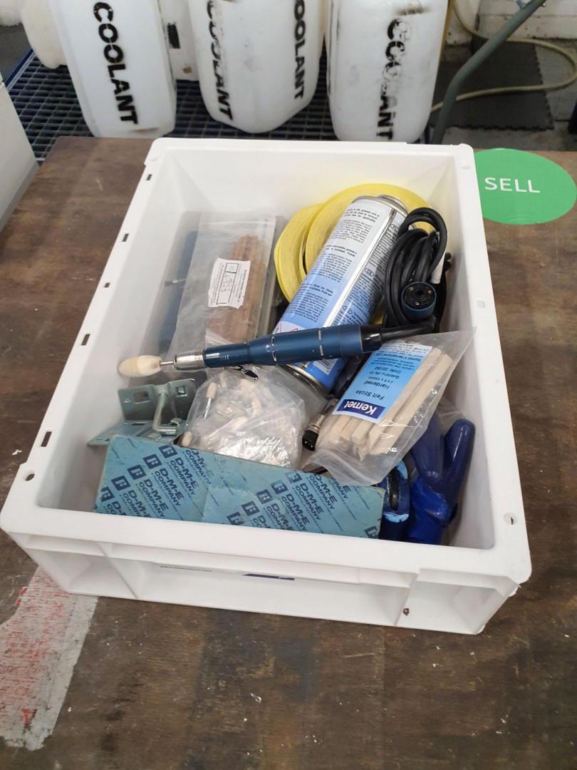 Qty consumables inc: Trizact belts, white single sided silicone etc tape, blue hybrid examination gloves, Kennametal / Iscar etc tips etc (mainly boxed & unused)