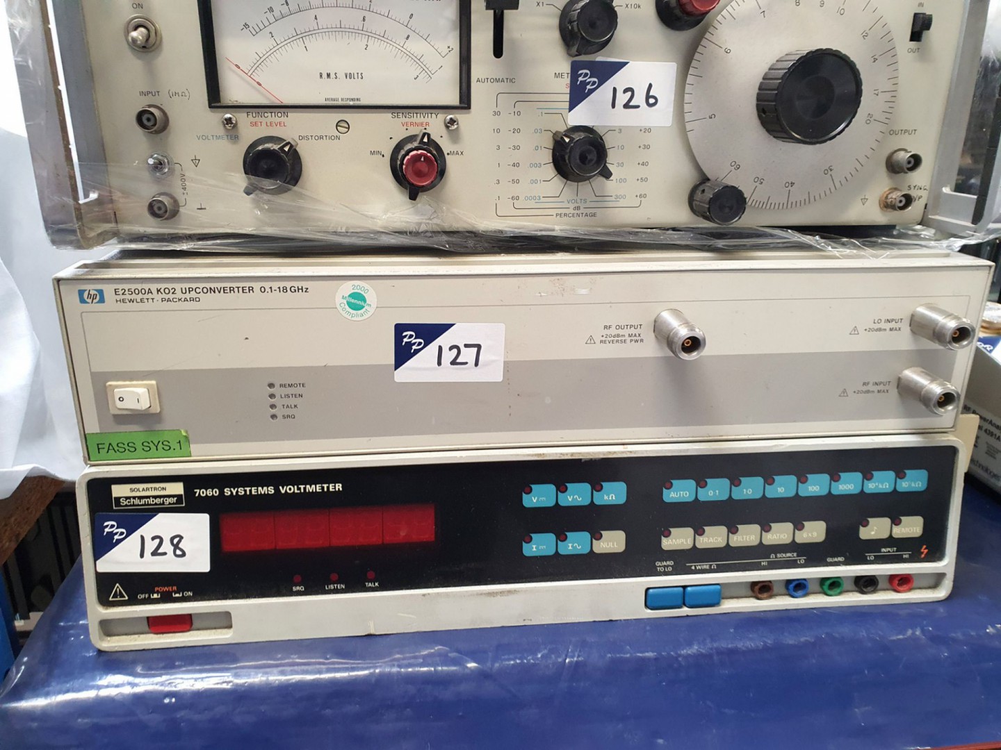 Philips PM5190 LF synthesised signal generator. 2x Racal Dana 9300 RMS voltmeter. Fluke 8010A & 8050A digital multimeters. Tektronix TM5003 main frame. Marconi TF2700 universal bridge. 2x National VP9631A millivoltmeter. HP 435A & 435B power meters. HP 3400A millivoltmeter. HP / Agilent E1416A VXI power meter card. HP E1474A VXI card, RF multiplexer. Agilent E1411B 5.5 digit digital multimeter VXI card. 2x Canberra 8076 ADC card. Tektronix 7000 Series plug in. 2x Casella BS5248 aspirated hygrometer. Codan 5900 KU-band converter. Marconi 2850 digital transmission analyser. Agilent 16700B logic analyser. EIP 545A microwave counter. Symmetricom 4059B distribution amplifier. Rapco 1876C frequency distribution unit. 2x Panasonic VP-8401B TV signal generators. 2x Marconi 2305 modulation meters. 2x Intralux 4000-1 light sources. Wallis HiVolt DCM30/4A EHT meter. HP 37724A SDH/PDH test set. HP 8504A vector voltmeter mainframe.