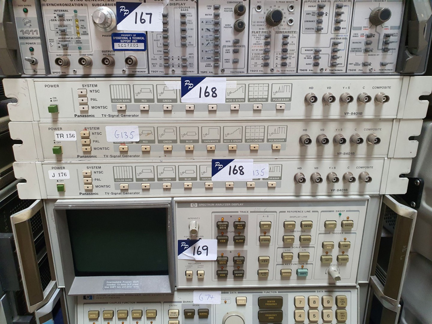 Tektronix 521A PAL vector scope. Tektronix DTG5078 data timing generator. HP/Agilent 3771C communications performance analyser. Fluke 8520A digital multimeter. HP / Agilent 8510 network analyser.