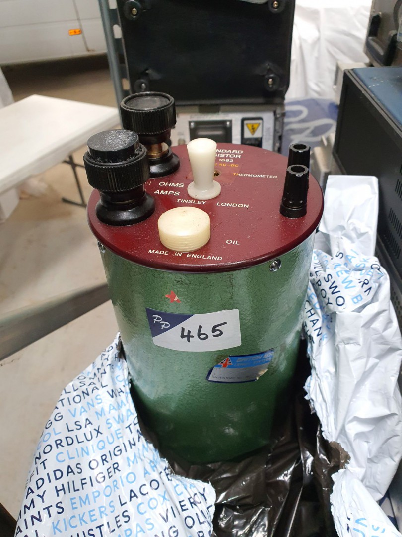 Sullivan C8003 reference standard capacitor. 2x National VP7705A dual channel distortion meter. Anritsu MD6420 A5 data transmission analyser. Micromovements M2200-8 chart recorder. Clarostat 240-C power resistor box. Agilent J2127A transmission test set. Valhalla 4014 digital ohm meter. Leader LAB 191 audio test set. Racal Dana 9475 rubidium frequency standard. HP/Agilent 8349A microwave amplifier. 2x Marconi 2955A mobile radio test set. Tinsley 1682 standard resistor. Tektronix 1730 waveform monitor. Racal Dana 9514 universal timer counter. Enertch/Schlumberger 4431/4 20MHz programmable function generator. Alenia/Marconi 2137 portable ILS. Tektronix 1741 waveform / vector monitor. Tektronix TM504 mainframe. UCC CM20 6 channel contamination monitor. Marconi 2955A battery pack. Farnell TSV 70 mark PSU. Hanna HI 92804C K thermacouple logging thermometer. W&G DMT-1 modem tester. BOFA fume extractor. Scientific Atlanta SA390 dynamic signal analyser. BICC 1105-0 isolan test unit. Time 1051 & Cropico RBB5C resistance box. Sullivan/Griffiths set of standard inductors. Tektronix P6201 FET probe. Hirst Magnetic GM04 gauss meter.