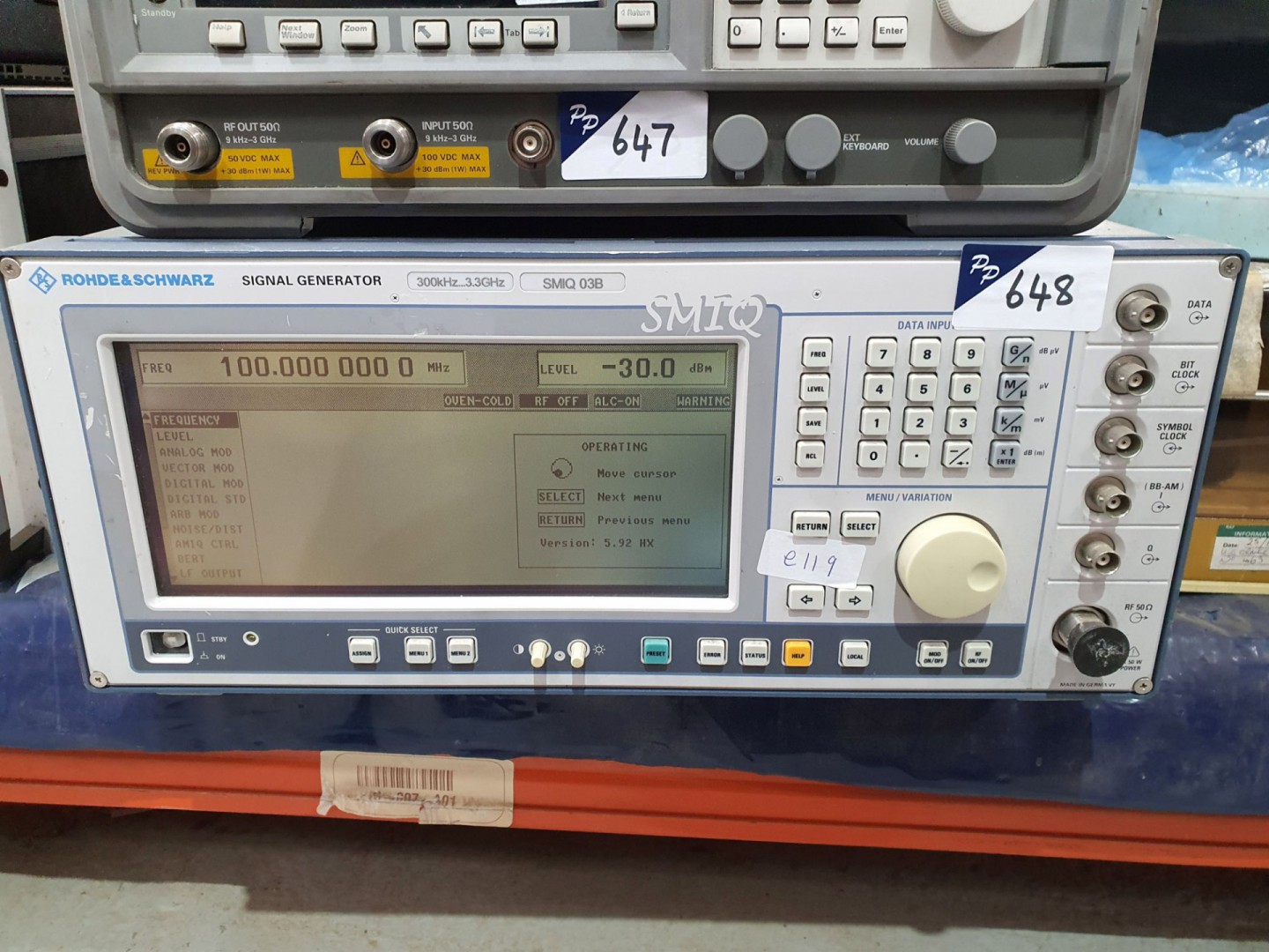Wavetek 650 variable phase synthesizer. HP/Agilent E1401A high power VXI mainframe. HP 3488A switch/control unit. Unaohm EP760S satellite/TV/FM field strength meter. HP / Agilent 85101C display section & 8514B S-parameter test set. Dbm LLC CNG-1-870/1750 carrier to noise generator. HP / Agilent 8782B vector signal generator. HP / Agilent 3577A network analyser. Agilent 8960 Series 10 E551C test set. Thandar TG 2002 20MHz sweep / function generator. HP 8620C with 86260A sweep oscillator. Racal Dana 9515 universal counter. 2x Blackstar 1325 counter timer. Lyons PG73N pulse generator. Racal Dana 9916 frequency counter.