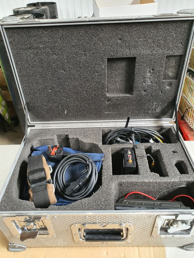 IDX VL-4S simultaneous quick charger. 4x Surrey Electronics Distribution 4 10 outlet amplifiers. Ronford Baker F4 camera tripod. Vinten camera tripod legs. Raycom RTB400X series. Canford audio rack. Blue transit case.