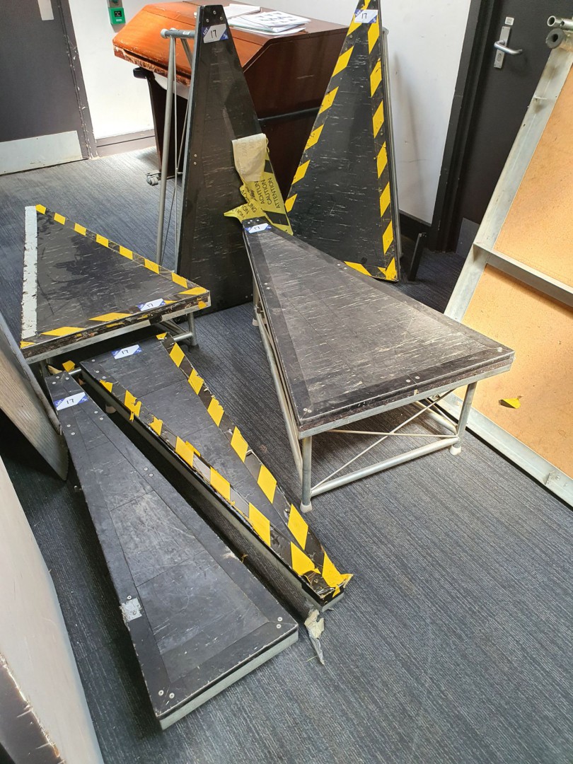 6x various Sico mkI triangular corner platforms / steps, 750kg SWL, 46x26x12", 48x27x18" & 48x13x8"