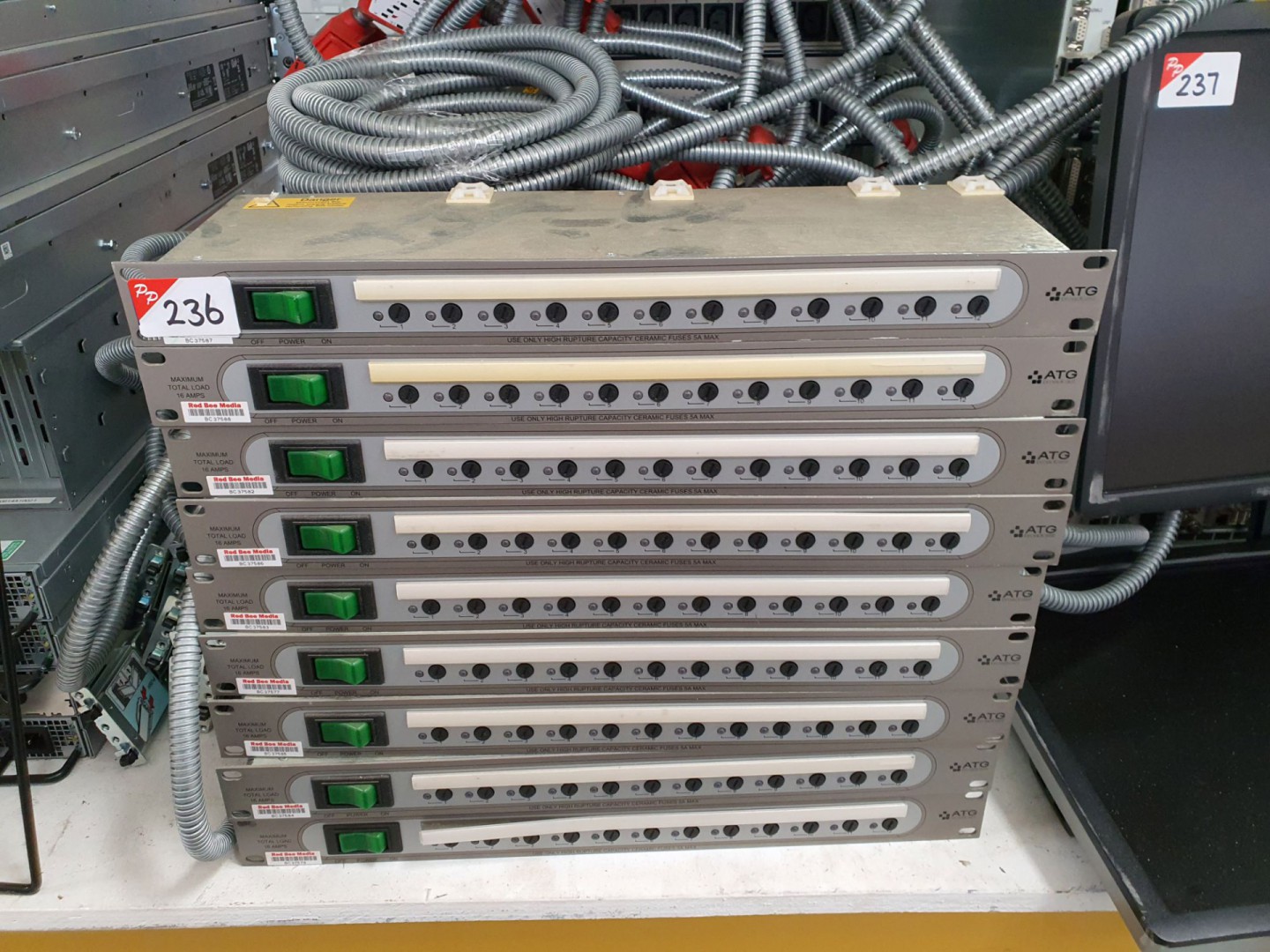 Various patch cords, cable, remote controls, servers, patch panels, frames, TV boxes, end user stations etc etc.
