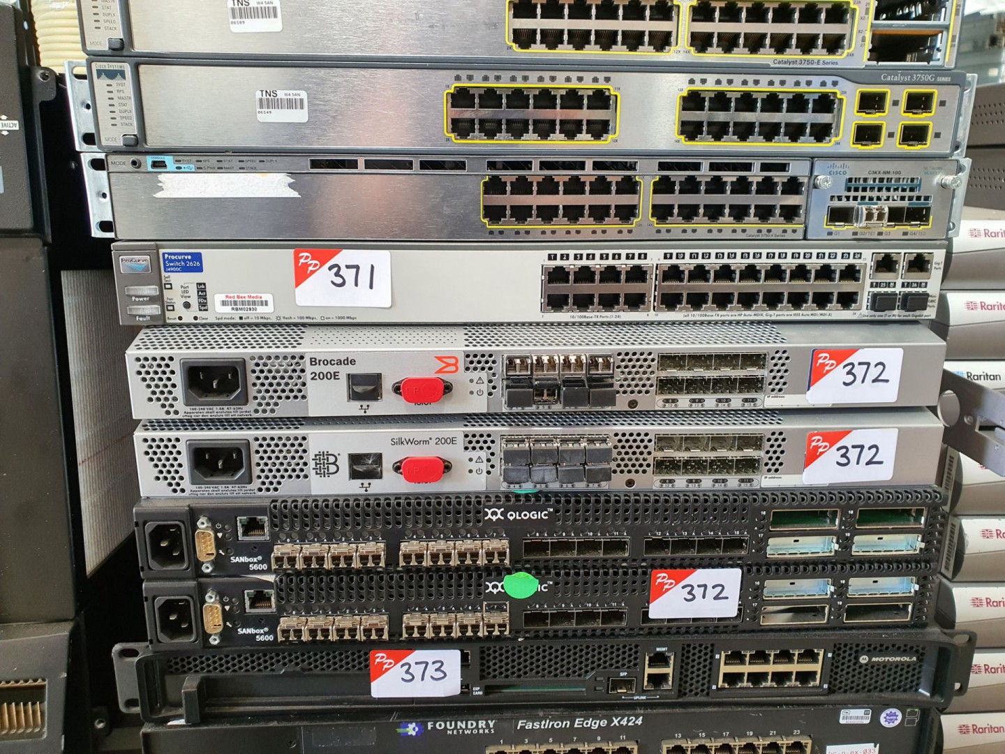 2x Brocade Silkworm 200E fibre channel switches, 2x Qlogic Sanbox 5600 fibre channel switches