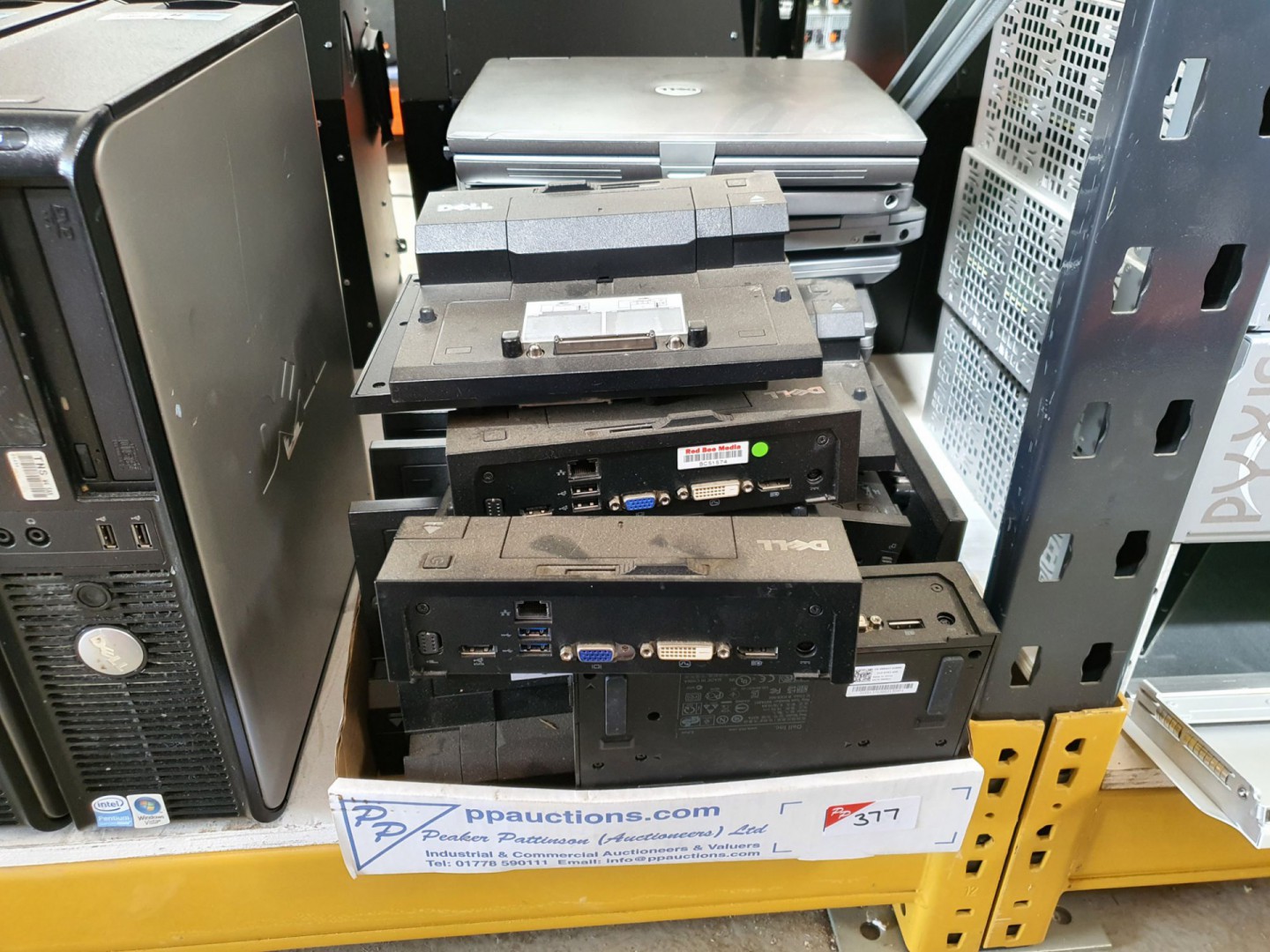 8x Dell K07A E-Port docking stations, 3x various miniature speakers & various Dell laptops (no PSUs)