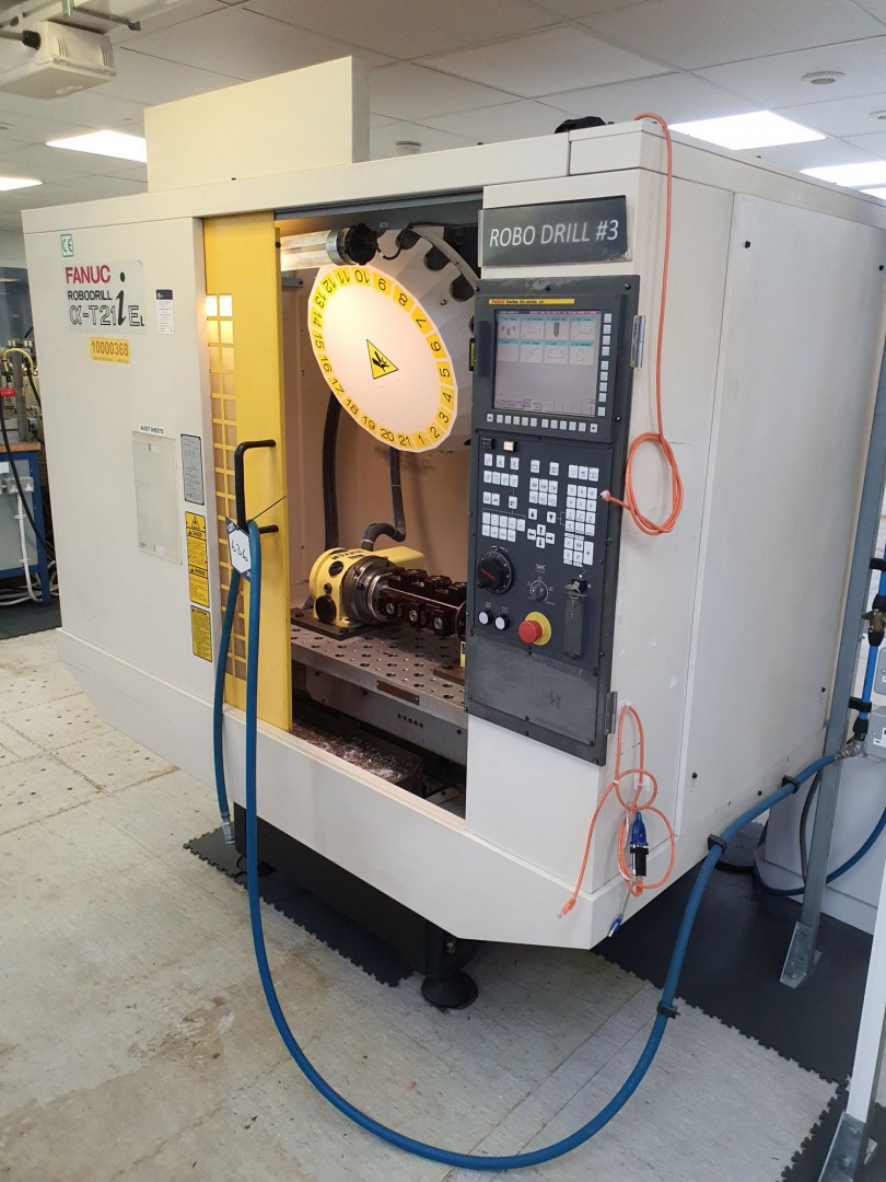 3x Fanuc Robodrill α-T21iDL CNC drilling / tapping machining centres, Series 16i-MB control, 1150x500mm table, 10,000rpm, 21 tool turret, Nikken 4th axis (2004)