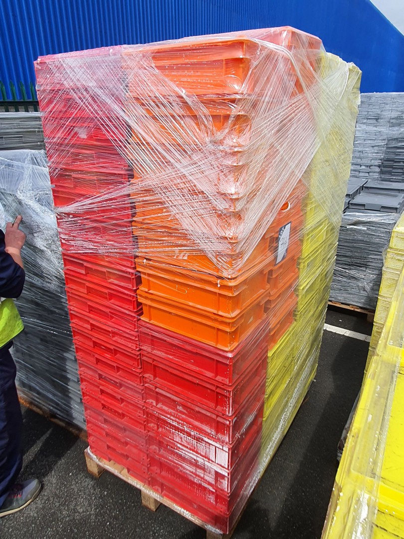 Qty various red / orange / yellow tote bins with lids, 400x300x120mm, 400x300x75mm on pallet