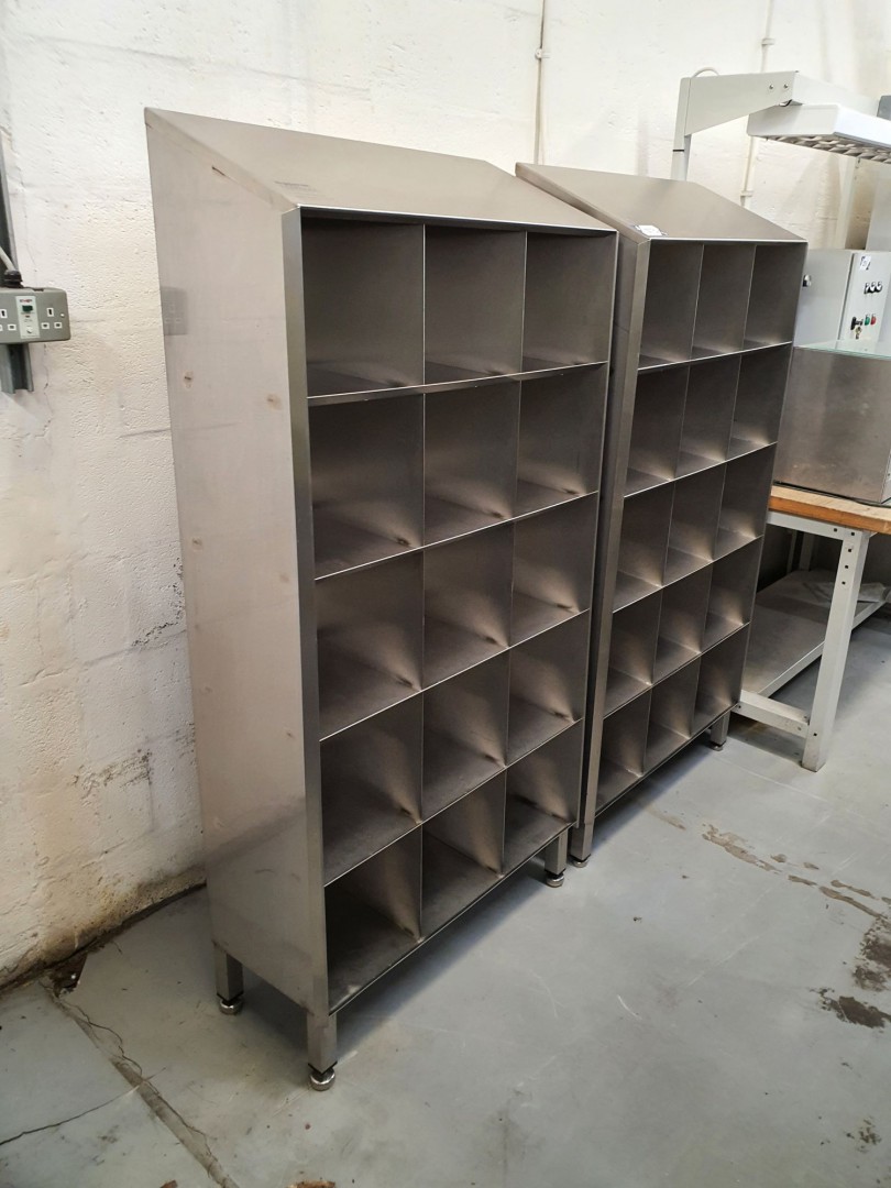 2x Teknomek Hygienox stainless steel pigeon hole storage racks, 900x360x1700mm
