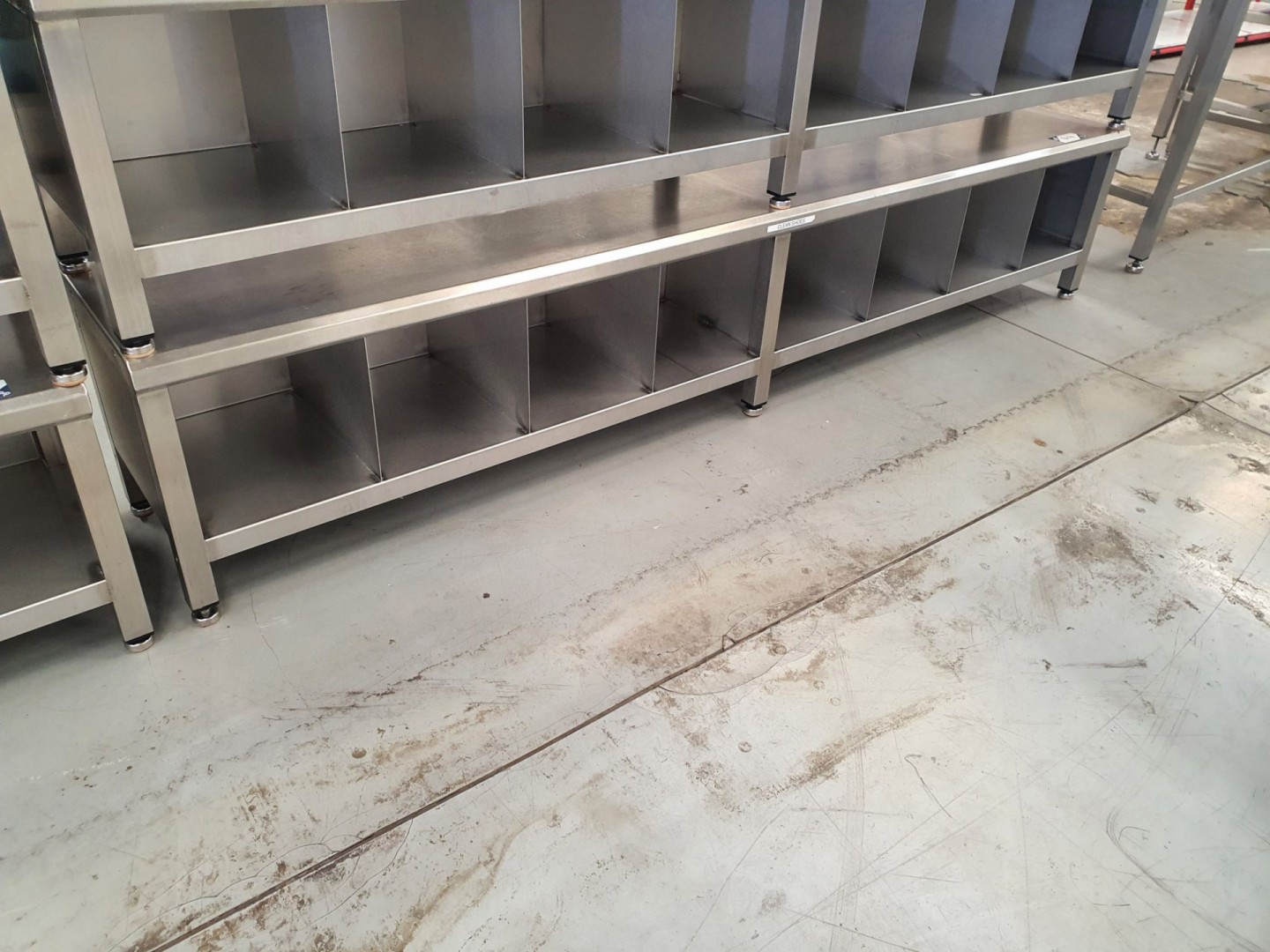 Qty various Bott, Teknomek etc stainless steel tables, benches, storage racks, shoe racks, cages, sinks, cupboards etc