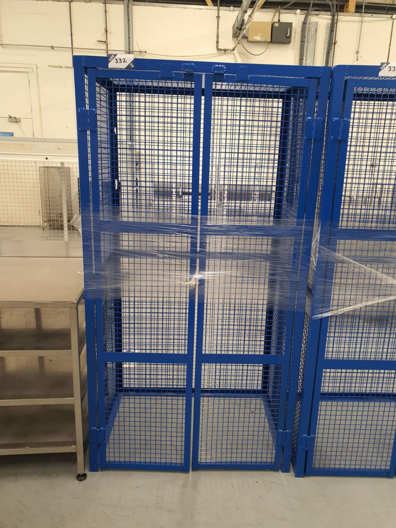 Qty various size wire mesh floor mounted storage cages, wire mesh doors etc