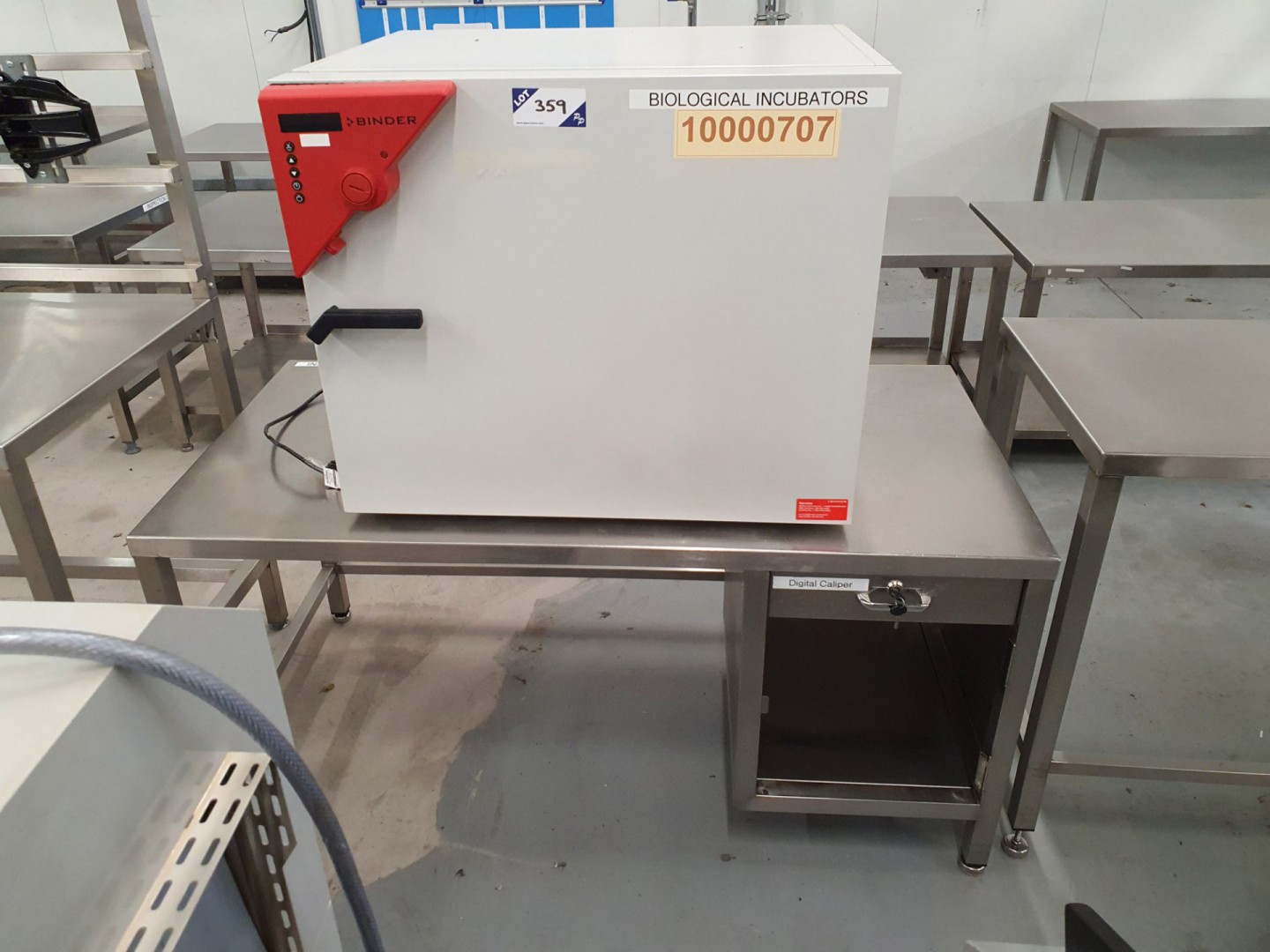 Binder BF115 laboratory oven, 100degC, 600x350x450mm ID on 1500x750mm stainless steel bench