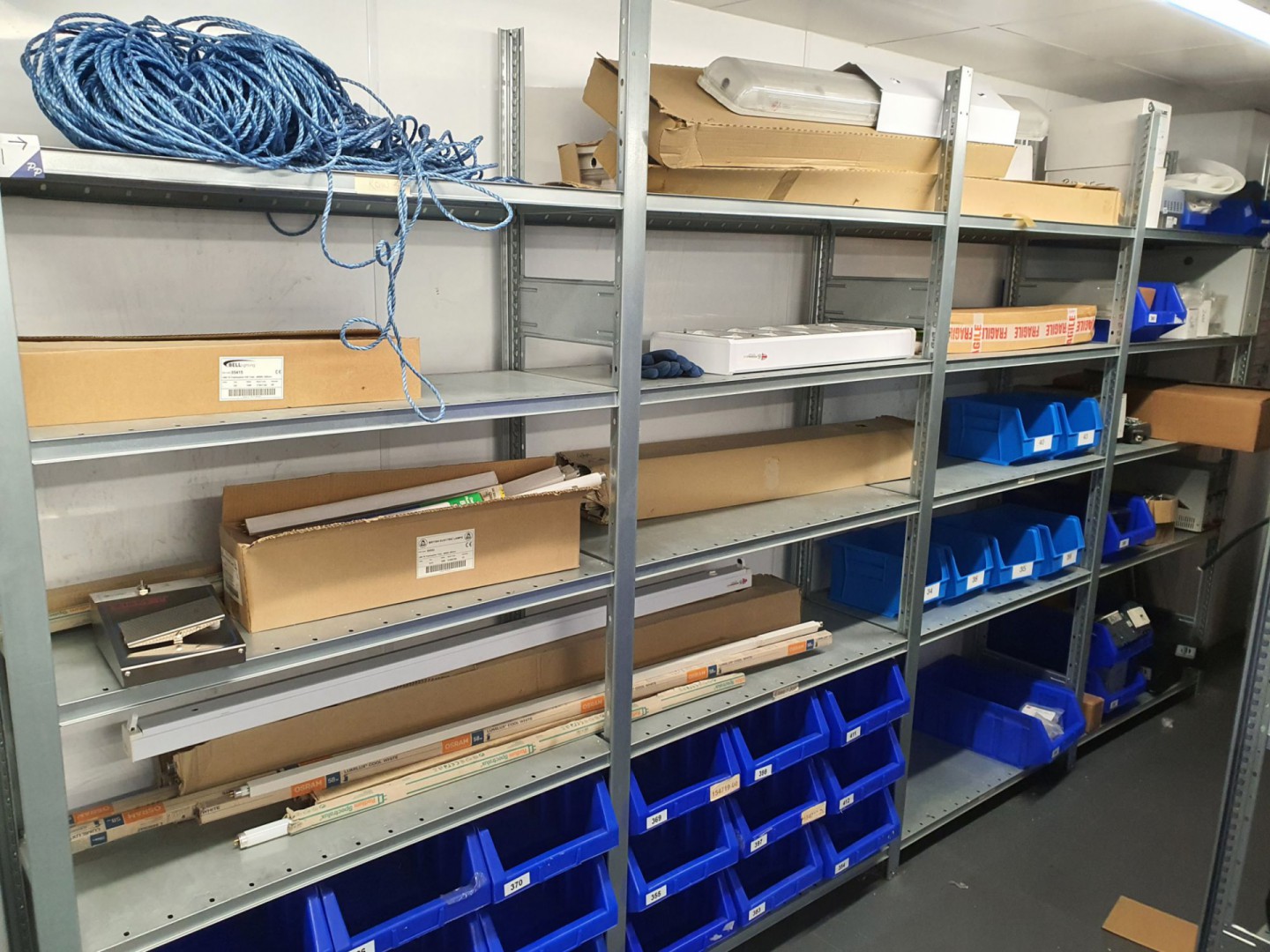 Qty various electrical spares inc: switches, inverters, power supplies etc on galvanised multishelf racking, bay size