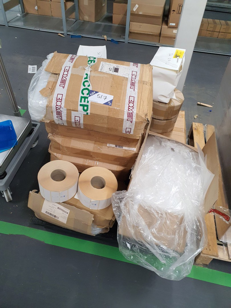 Qty various inc: labels, clear bags, pipettes etc on pallet