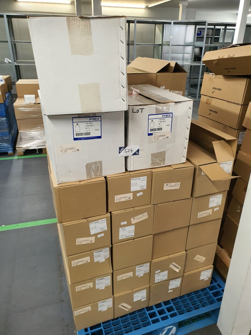 Qty various Pyrex, Avantor glass bottles, measuring beakers etc on pallet (boxed & unused)