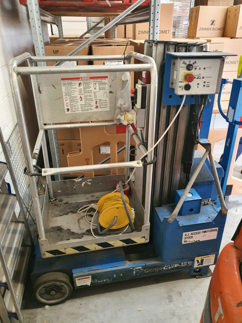Genie CWP-15S electric single person pedestrian lifter, 15ft max height, 350lbs SWL (1997)