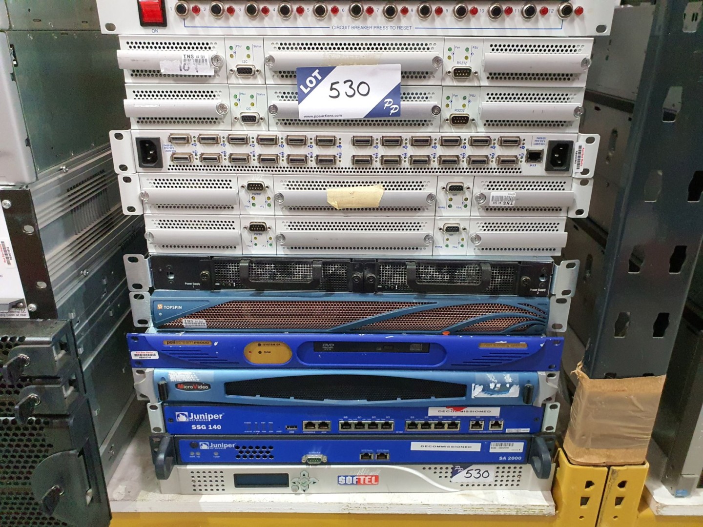 Flextronics F-X430061 Infinboard 24 port switches, Topspin 120 rack type power supplies, Softel data broadcast generator, Micro Video HDIU frame, Juniper network switches