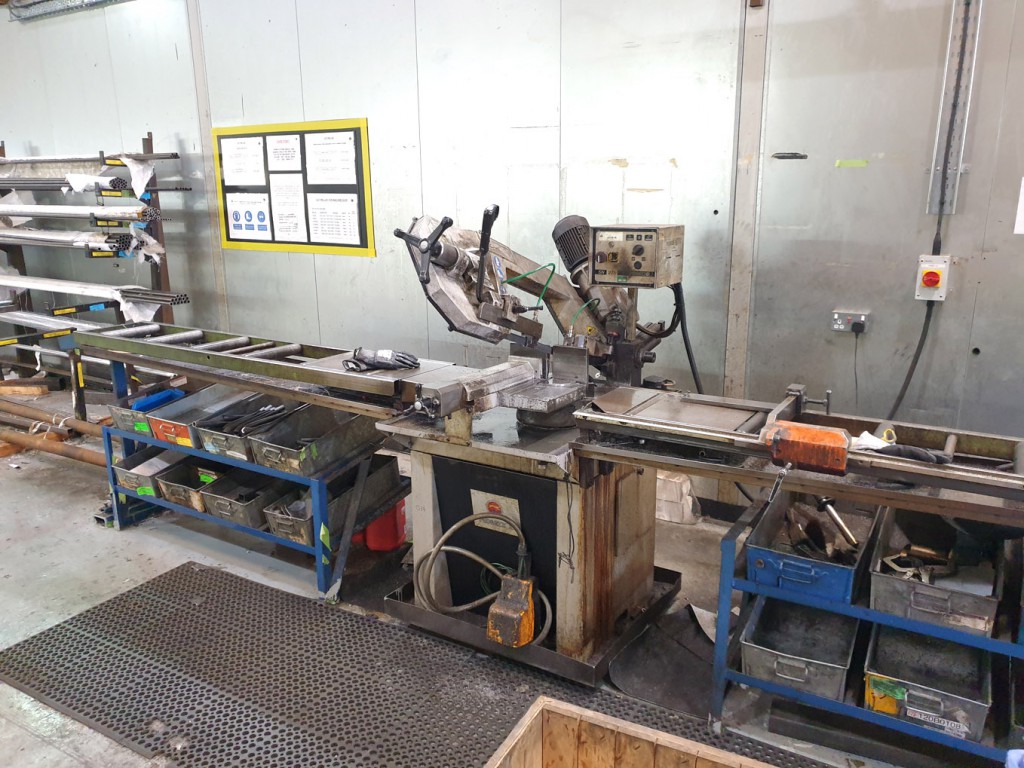 Pedrazzoli SN275 horizontal bandsaw, 300mm wide x 4000mm long roller conveyor, 150mm clamp - Please note this lot only needs to be collected between Monday 29th November - Friday 3rd December - Lot located at: LLS, Vulcan Road North, Norwich